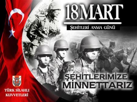 18 MART ŞEHİTLERİ ANMA VE MÜBAREK CUMA GÜNÜ NEDENİLYE, CENNET VATANIMIZ İÇİN SEVE SEVE CANLARINI FEDA AZİZ ŞEHİTLERİMİZİ, VEFAT EDEN KAHRAMAN GAZİLERİMİZİ, TÜRKİYE CUMHURİYETİ DEVLETİMİZİN KURUCU GAZİ MUSTAFA KEMAL ATATÜRK VE SİLAH ARKADAŞLARINI RAHMETLE VE MİNNET ANIYORUZ.