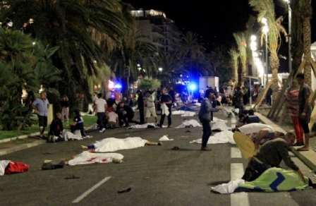Fransa’nın güneyindeki Nice’de, 14 Temmuz Bastille Günü kutlamaları sürerken, Promenade Des Anglais Caddesi nde saat 22.30 sıralarında bir kamyon kalabalığın arasına daldı. Havai fişek gösterilerini izleyen kalabalığın içine 90 kilometre hızla girerek yaklaşık 2 kilometre ilerleyen kamyonun altında kalan ve üzerlerine ateş açılan 84 kişi hayatını kaybetti, 18 i ağır olmak üzere 100 den fazla kişi yaralandı. Saldırgan, polis tarafından etkisiz hale getirildi.