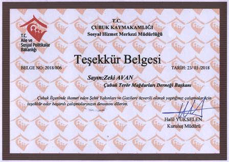 Aile ve Sosyal Politikalar Bakanlığı Çubuk Kaymakamlığı Sosyal Hizmet Merkezi Müdürlüğü tarafında, Çubuk Terör Mağdurları Derneği Başkanı Zeki Avan teşekkür belgesi ile onura edildi.