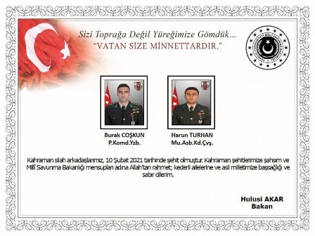 Bakanlıktan yapılan yazılı açıklamada, “Irak kuzeyi Gara bölgesinde başlatılan Pençe Kartal-2 Harekâtında 10 Şubat 2021 tarihinde teröristlerle çıkan çatışma sonucunda iki kahraman silah arkadaşımız şehit olmuş, dört kahraman silah arkadaşımız ise yaralanmış ve derhal hastaneye sevk edilmiştir. Bölgede tespit edilen hedefler hava harekâtı ile isabetle vurulmuş, terör örgütünün söz konusu bölgedeki varlığına ağır bir darbe indirilmiştir. Bizleri derin bir acı ve üzüntüye boğan bu olayda hayatını kaybeden aziz şehitlerimize Allah’tan rahmet, kederli ailelerine, Türk Silahlı Kuvvetleri ile asil milletimize başsağlığı ve sabır, yaralı personelimiz için acil şifalar dileriz” denildi.