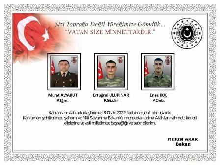 Milli Savunma Bakanlığı, Şanlıurfa nın Akçakale ilçesindeki sınır hattında teröristlerce döşenen el yapımı patlayıcının (EYP) patlaması sonucu 3 askerin şehit oldu.