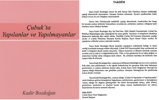 İlçemiz yazarlarından Sayın Kadir BOZDOĞAN, Çubuk’ta Yapılanlar ve Yapılmayanlar isimli kitabını, Çubuk Platformu tarafından, 26 Ağustos 2008 günü akşam saat 20.00’de Esenboğa Airport Hotelde düzenlenen 2.geleneksel ödül töreninde, Dernek Başkanı Zeki AVAN’a, yapılan törenle teslim etti.