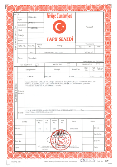 Derneğimiz adına almış olduğumuz bu gayrimenkullerin tapularını şehitlerin adına alınmıştır. Hiçbir kişi ve şahısların adına değildir. Aşağıdaki görmüş olduğunuz tapu fotokopileri, derneğimiz adına almış olduğumuz gayrimenkullerin fotokopileridir.