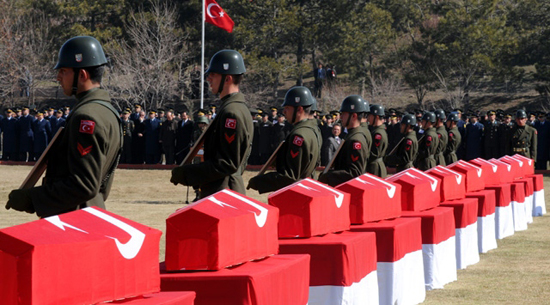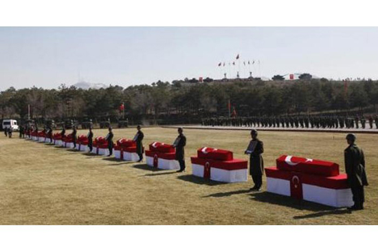 Şehit 12 Türk askeri için Mamak taki 4 üncü Kolordu Komutanlığı nda düzenlenen ilk törene şehit yakınlarının yanı sıra Cumhurbaşkanı Abdullah Gül, TBMM Başkanı Cemil Çiçek, Başbakan Recep Tayyip Erdoğan, Genelkurmay Başkanı Orgeneral Necdet Özel, CHP Genel Başkanı Kemal Kılıçdaroğlu, MHP Genel Başkanı Devlet Bahçeli, Avrupa Birliği Bakanı ve Başmüzakereci Egemen Bağış, Dışişleri Bakanı Ahmet Davutoğlu, İçişleri Bakanı İdris Naim Şahin, Milli Savunma Bakanı İsmet Yılmaz, Kara Kuvvetleri Komutanı Orgeneral Hayri Kıvrıkoğlu, Deniz Kuvvetleri Komutanı Oramiral Murat Bilgel, Hava Kuvvetleri Komutanı Orgeneral Mehmet Erten, Jandarma Genel Komutanı Orgeneral Bekir Kalyoncu, Ankara Valisi Alaaddin Yüksel, bazı milletvekilleri ve emniyet mensuplarıyla askeri personel katıldı. Protokol üyeleri, şehit yakınlarına taziye dileklerini ilettikten sonra yerlerini aldılar. Şehit cenazeleri tören alanında bekleyen ambulanslardan alınarak katafalklara konuldu ve saygı duruşunda bulunuldu. Barış Gücü Tugay Komutanı Tuğgeneral Mehmet Karadayı, törende yaptığı konuşmada, şehit yakınlarına Bu kutsal mesleği seçen evlatlarınız Türk Silahlı Kuvvetleri ne adım attıkları gün bizlerin de evladı, kardeşi oldular. Gözyaşlarınızı ve büyük acınızı yürekten paylaşıyoruz diye seslendi.