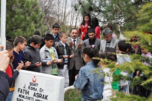 Dernek ziyaretinin ardından üyeler, eğitmenleri Özlem Çelik ve dernek başkanı Zeki Avan ile birlikte, Çubuk Paşa Mezarlığındaki şehitlerimizi ziyaret ettiler. Din görevlisi Tuncay Özbey tarafından okunan Kuran-ı Kerim Van’da vatani görevini yaparken 2008 yılında şehit düşen Jandarma Komando Er Fatih Asrak’ın mezarı başında hazır bulunan babası Muharrem Arsak ve Annesi Hatice Arsak ile birlikte dinlendi, minik eller açılarak dua edildi. Şehidimizin anne ve babasının acısı ve gururu paylaşıldı.